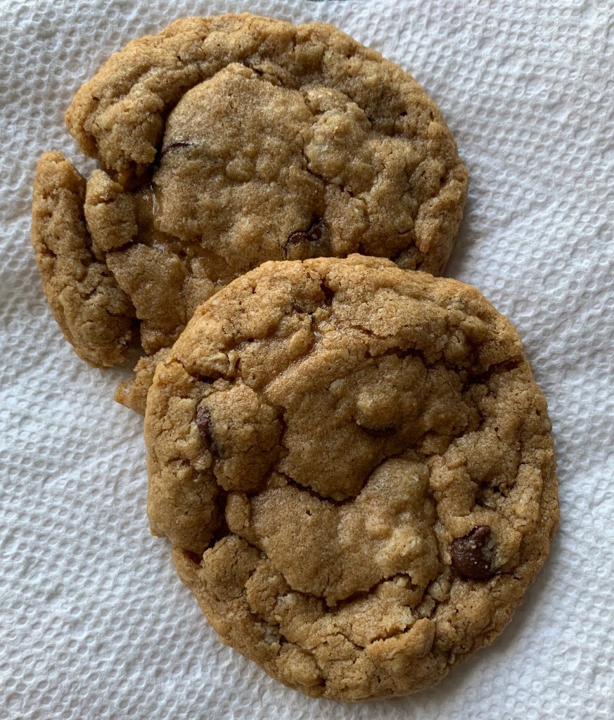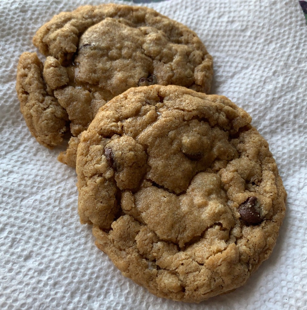I’ve wanted to try Kodiak Cakes’ products for awhile now, and I decided that these cookies would be a good place to start. All you need to make them is a stick of softened butter and an egg. They took about 5 minutes to whip up and portion out. If you wanted to be super accurate with your serving size, I would suggest using a kitchen scale because the serving size is in grams. Being the broke and lazy college student I am, I just guessed. The box says they’ll make about 18 cookies, so I made 18 balls that were roughly the same size. Since the cookies clock in at 160 calories per cookie, and knowing my self-control when it comes to cookies, I decided to bake 2 for myself tonight and stick the other dough balls into a tupperware container and popped that baby in the freezer. (Ngl, I’ll probably eat at least one of the raw dough balls at some point this week) After my two cookies were baked, I took them out of the oven and they looked and smelled delicious.
